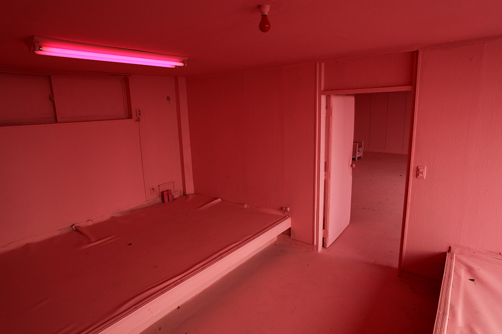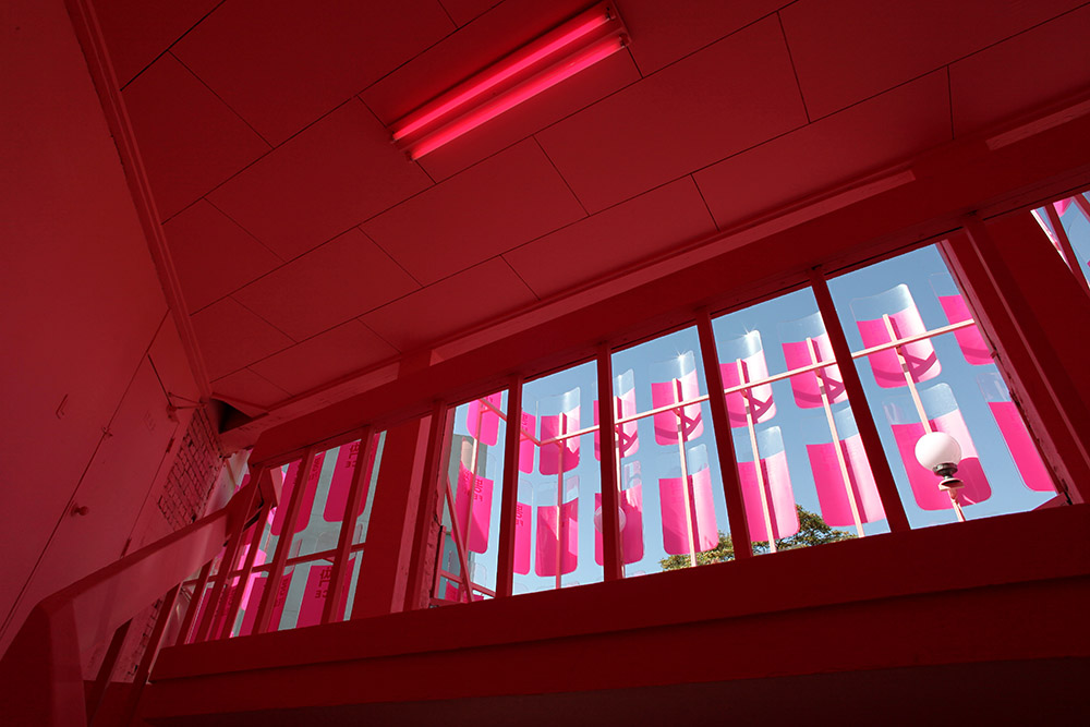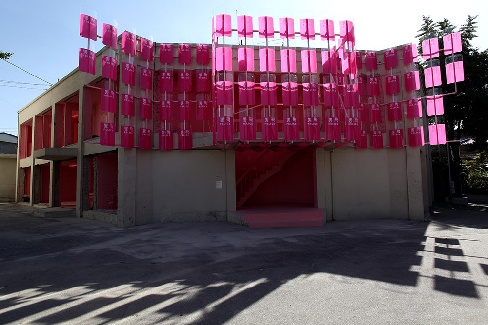 The project aimed to radically transform an old military drivers’ facility using modified police shields. The walls of the building have been removed and the all interiors, [furniture, lights, walls and toilets] painted pink. The shields color have been modified [from blue to pink] and the writing have been altered, from 경찰 [police] to 뽕짝 [polka] and from “police” to “felice”[happy in Italian]. Finally, the 112 transformed pink police shields were applied onto the main facade and successfully turned a gloomy military building into a happy performing venue.