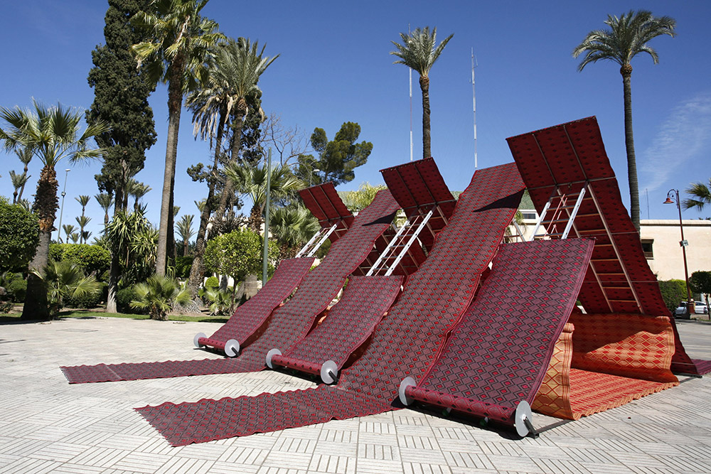 TENTative is a public installation project, curated by Hilario Isola, produced by Voice Gallery and presented at the 6th Marrakech Biennale. The project consists of three tents, twenty square meters each, installed in different strategic locations throughout the entire duration of the Biennale. Each tent was designed by a different artist and it offered a new interpretation of traditional temporary dwellings: the audience was allowed to interact with all the pieces and use them in the way they thought was more appropriate.